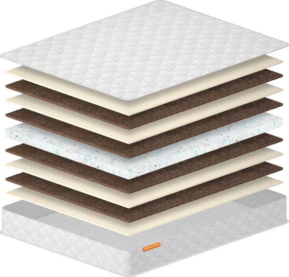 Наполнитель ортопедическая пена, с одной стороны, придает матрасу умеренную жесткость, делает его удобным для сна в любом положении. Слой из кокосовой койры, с другой стороны, придает матрасу повышенную жесткость, которая полезна для правильного здорового сна. Кроме того, койра – гипоаллергенный материал, поэтому не вызовет раздражения даже на чувствительной коже. Чехол для матраса выполнен из хлопкового трикотажа. Благодаря беспружинной конструкции модель Татами может выдерживать вес до 140 кг на одно спальное место и не продавливаться на протяжении всего срока использования.